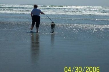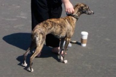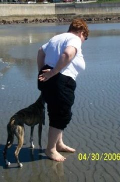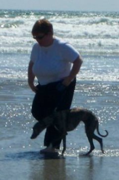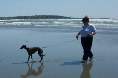 | With 14 whippets between us, it was ONLY Hannah who wound up attending the AWC National in Boston. Having left Jamie with Jim Radcliffe to have ACL surgery, we knew that we couldn't pick him up before noon on Monday, so took our time leaving Boston. We meandered along the coast and since the tide was out at Lynn, MA we took advantage and introduced Hannah to the ocean. |