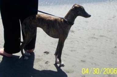 | informally known as Hannah. In October of 2005, on the way to judge a lure coursing trial, I happened to mention that I was thinking about getting another show whippet. Well, Karen just happened to know that Linda had a litter of Jamie grandchildren on the ground in IL. And the rest is, as they say history <g>. |